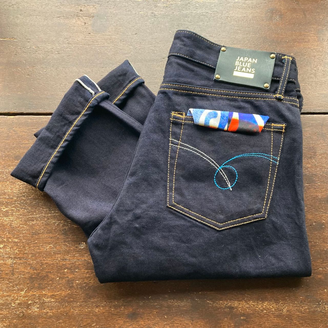 ぜーんぶ見て回り、私が買い求めたジーンズは「JAPAN BLUE JEANS」というブランドです。ここでしか買えない児島店限定のジーンズでバックポケットに施された白と青のステッチは児島のシンボルである“瀬戸大橋”と瀬戸内海をイメージしたもので、本革を使ったレザーパッチも気に入りました。なかなかのお値段でしたが長ーく履き続けて、いい色に育てていこうと思います