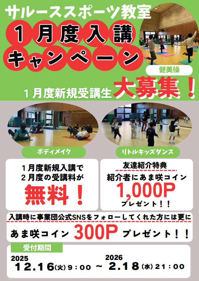 サルーススポーツ教室1月度入会の方は、翌月の2月受講料が